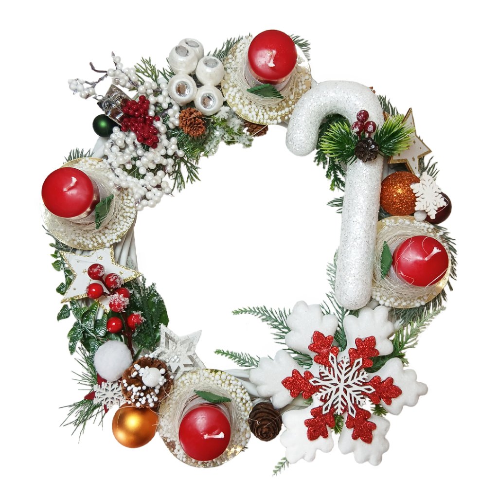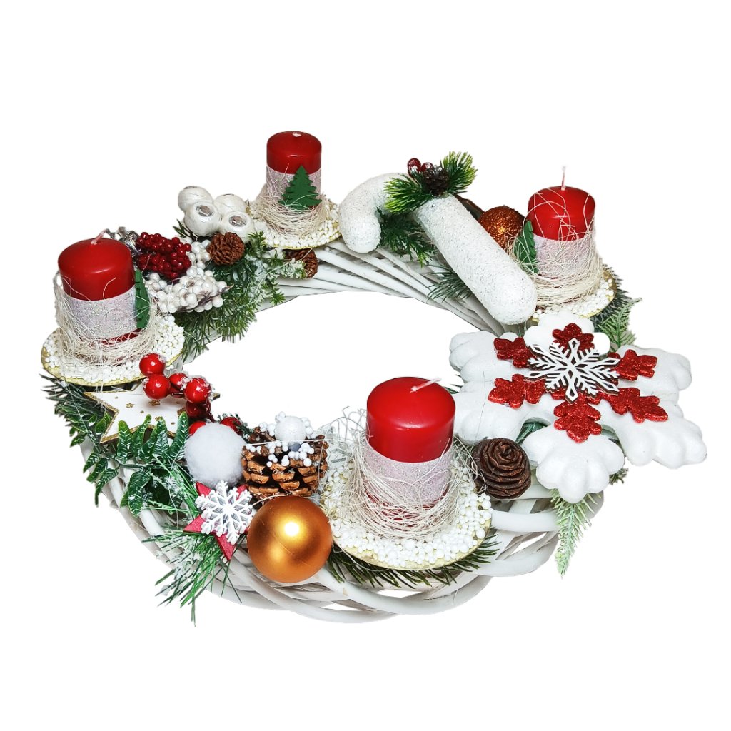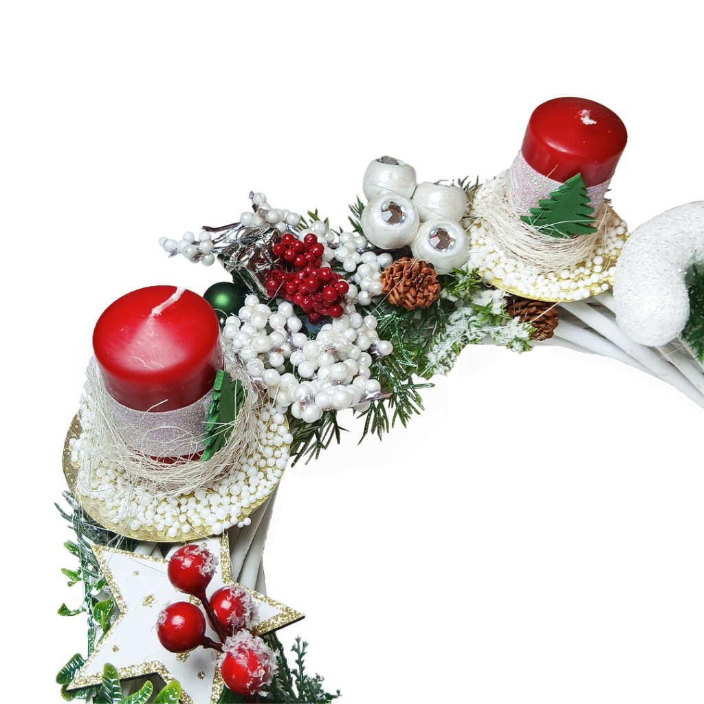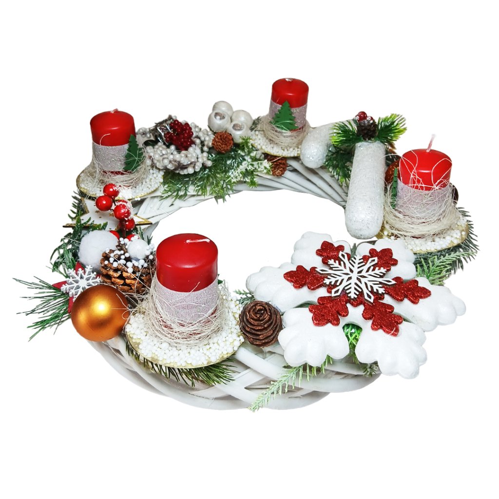 Dekorativní Vánoční svícen na 4 svíčky s červenými doplňky a šiškami