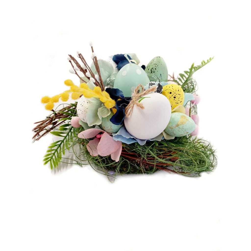 Svícen je vyroben z přírodních materiálů, jako jsou větvičky, lýko a dekorační tráva, které vytvářejí dojem hnízda.