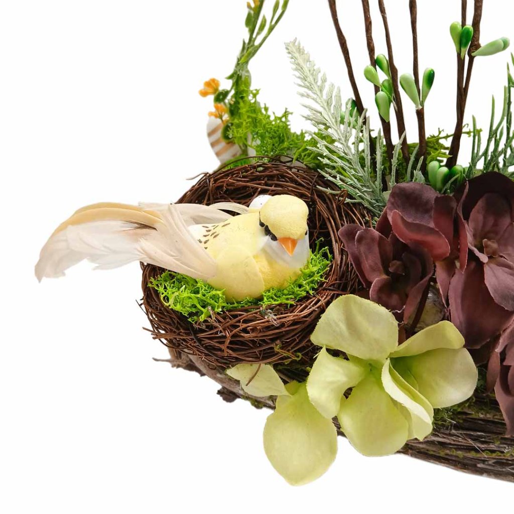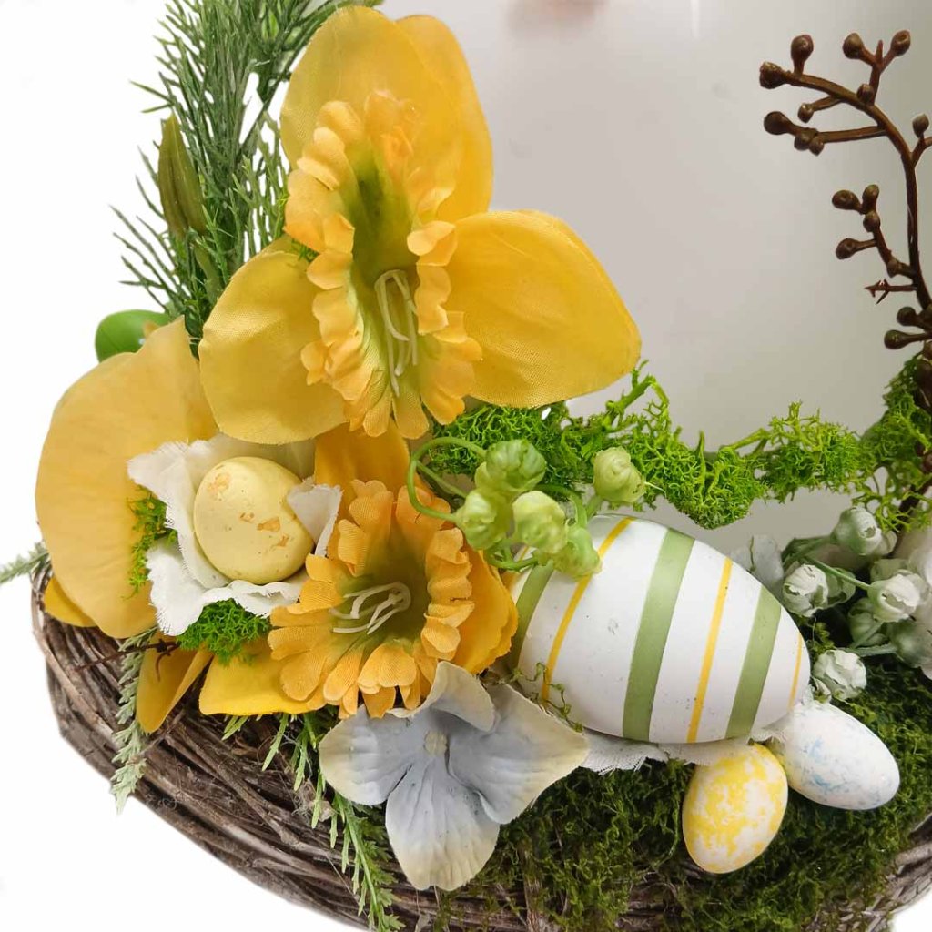 Jarní, nebo velikonoční věnec, plný barevných vajíček a žlutých květů.
