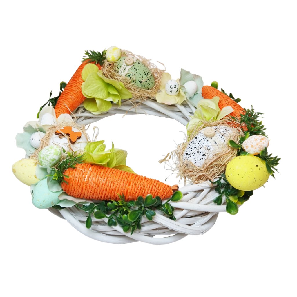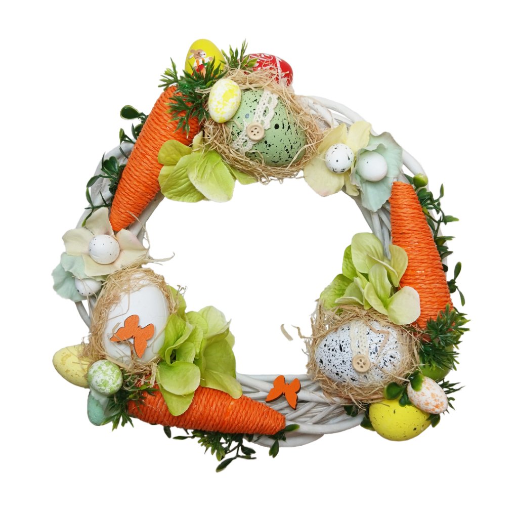 Velikonoční věnec zdobený kraslicemi a mrkvičkami