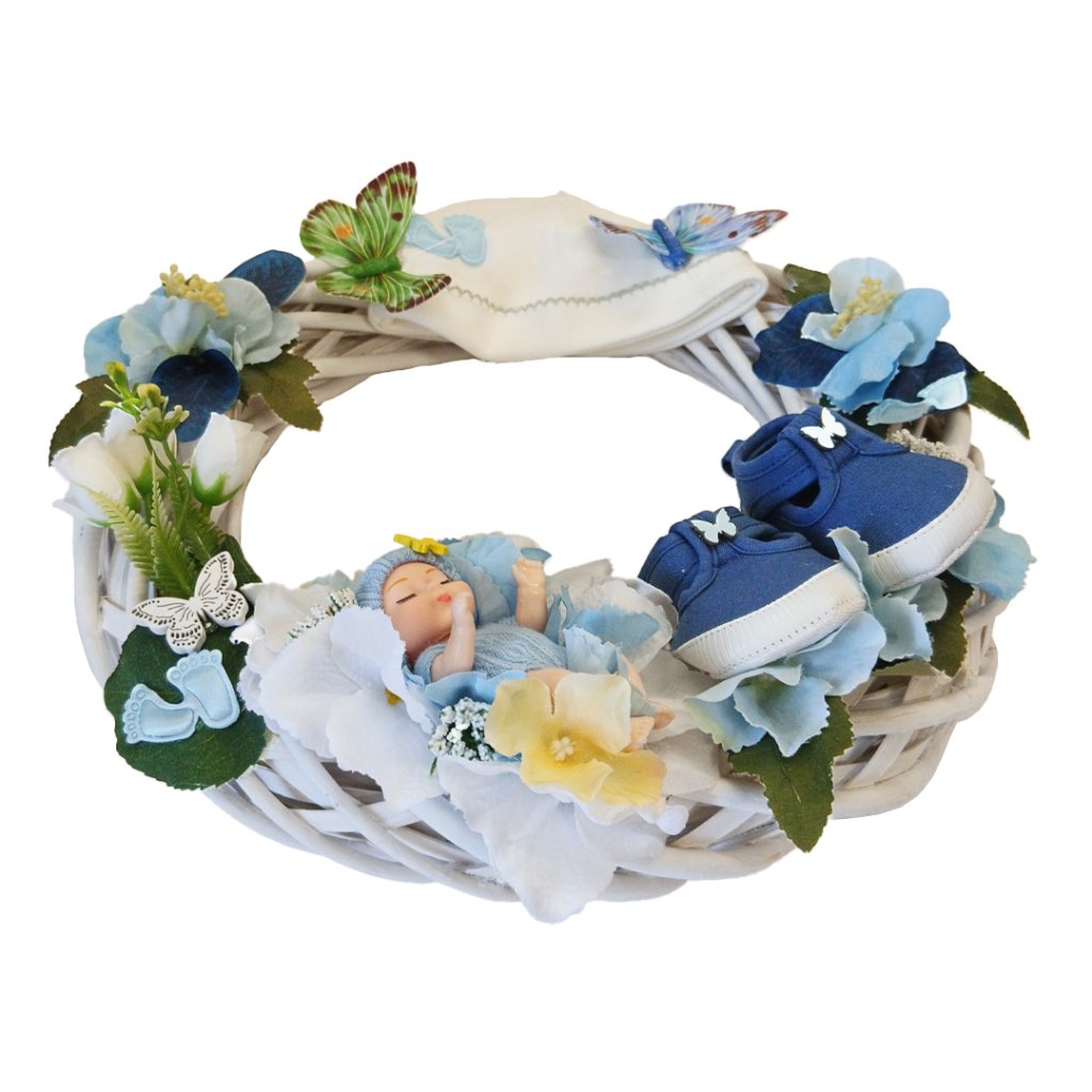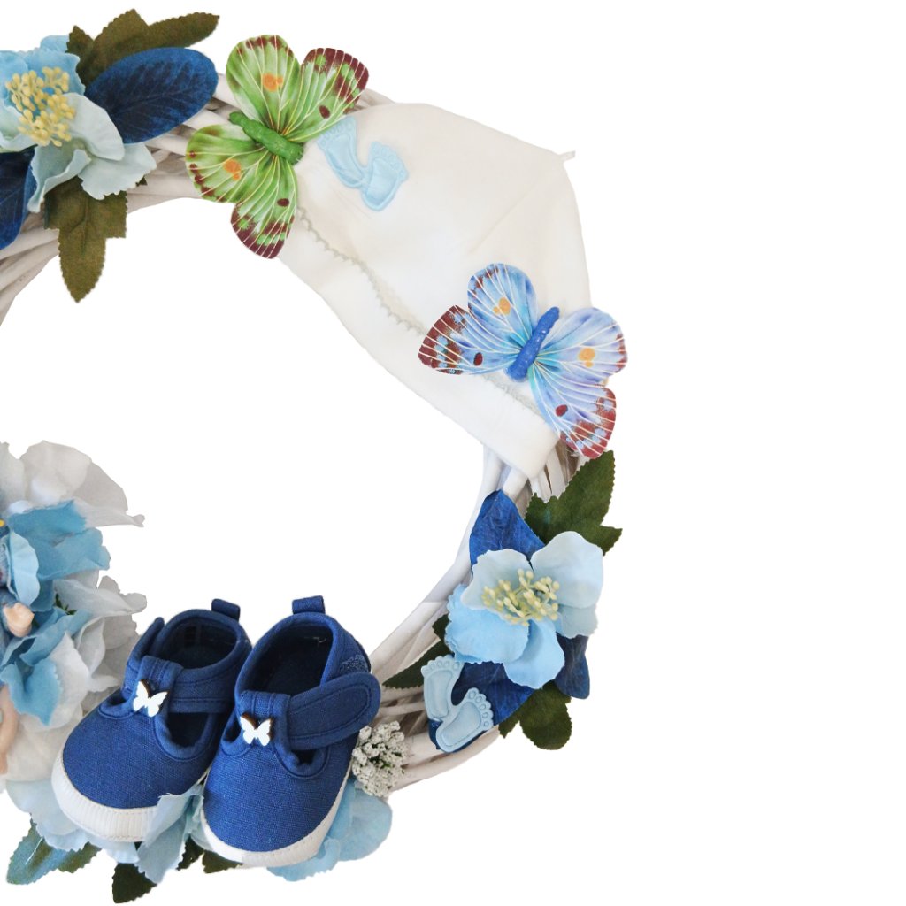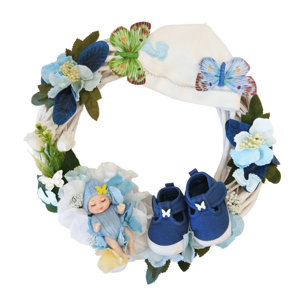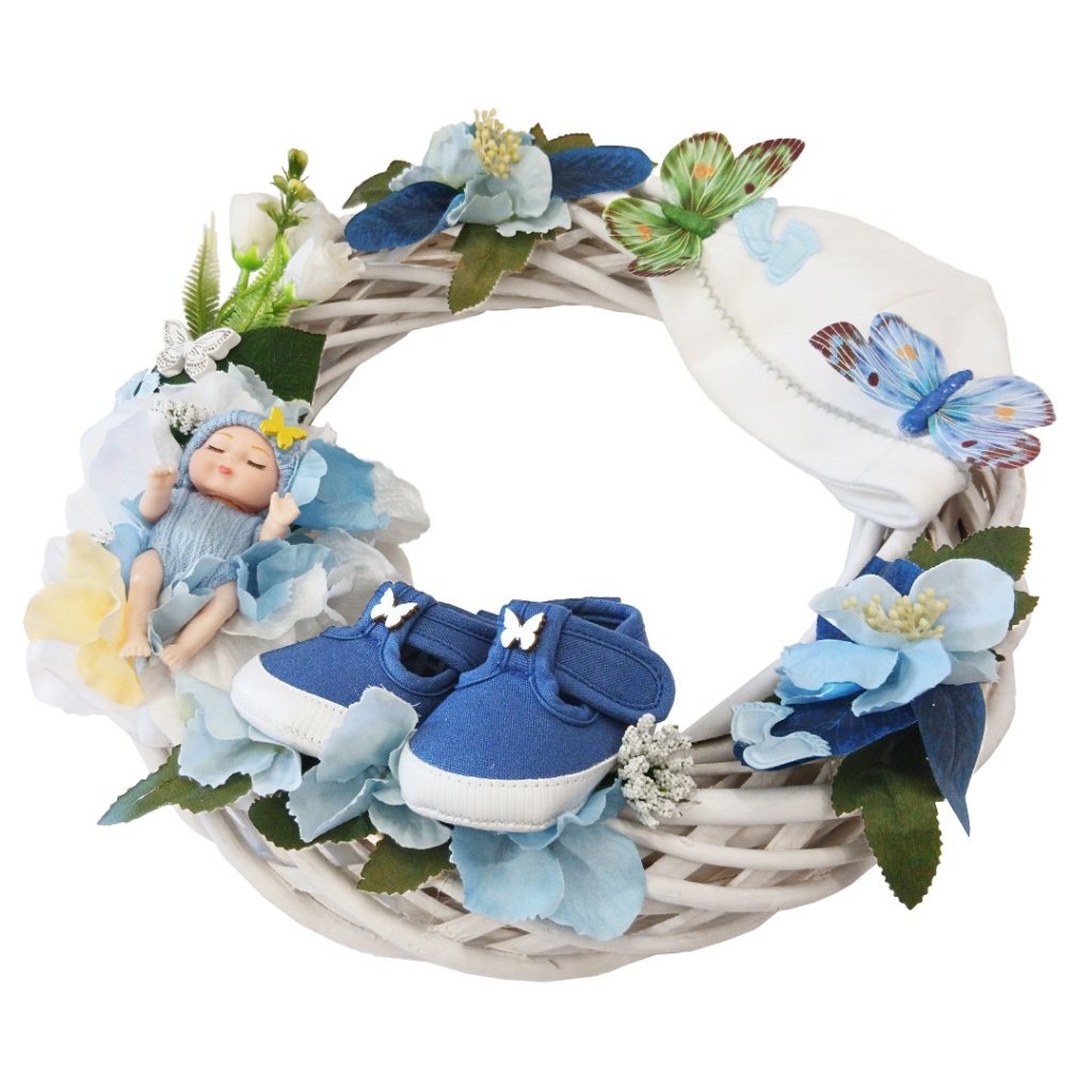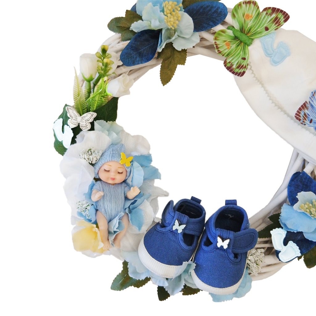 Krásný a originální věnec pro Vaše miminko. Tato jedinečná dekorace je ideálním doplňkem do dětského pokoje nebo skvělým dárkem pro novopečené rodiče. Zdobený přirozeně vypadajícími umělými květinami, dekorativními větvičkami. Věnec byl ručně vyroben v naší dílně s maximální péčí a důrazem na každý detail.
